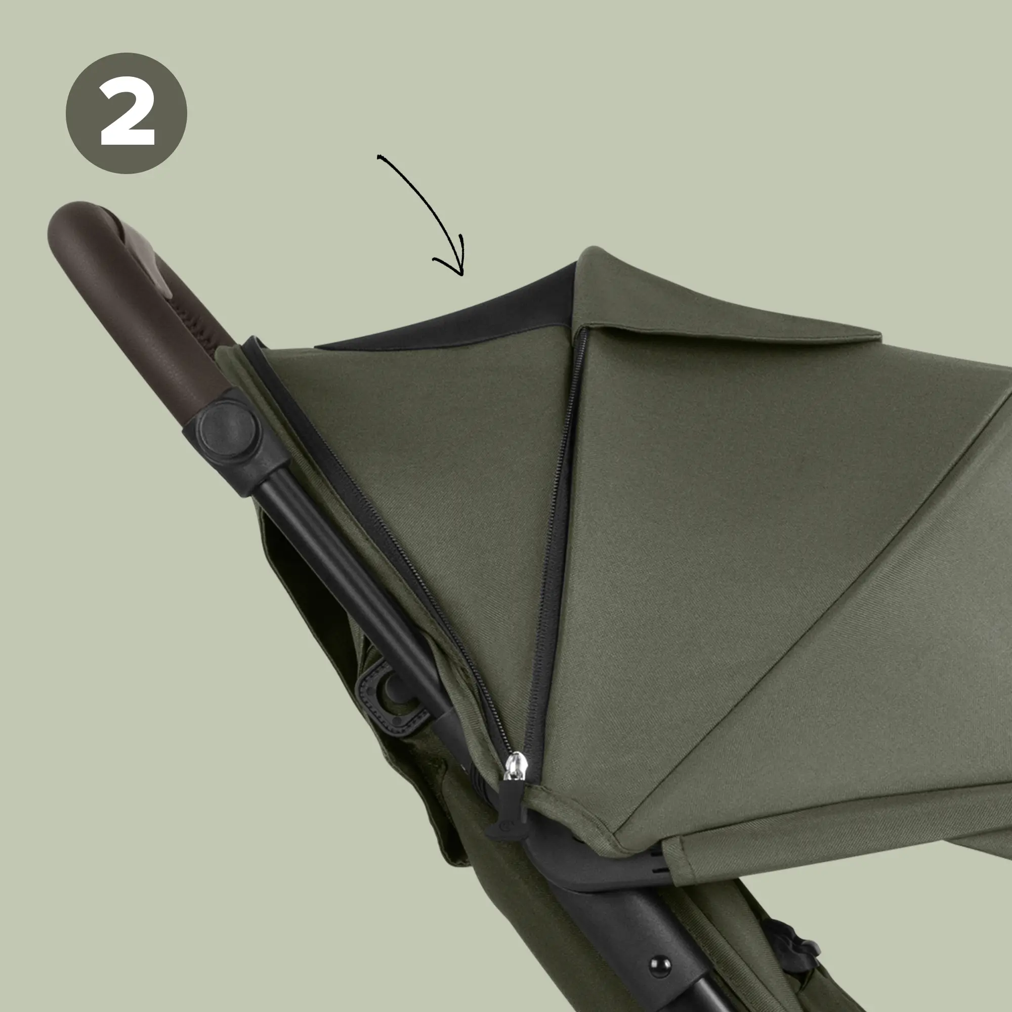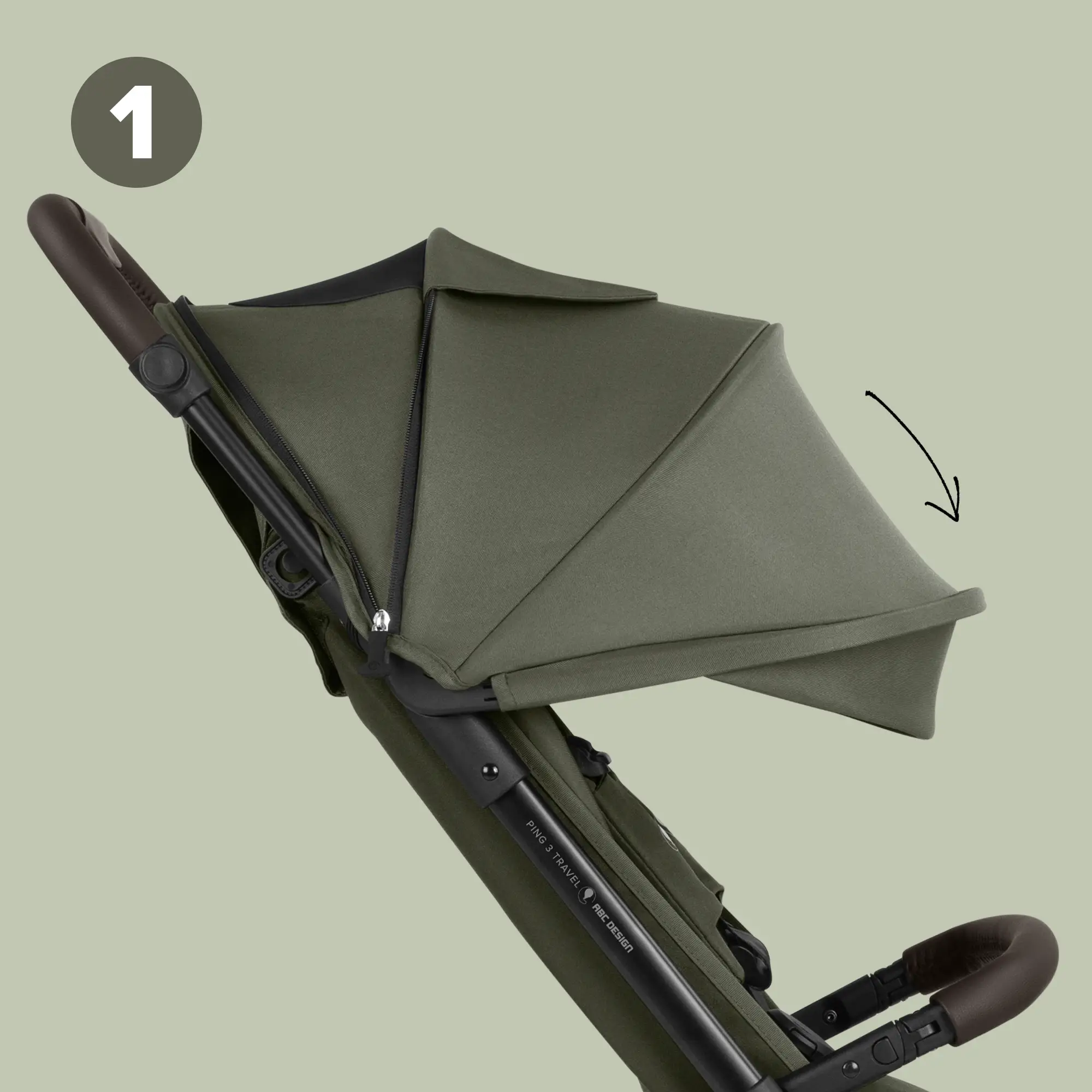 El Ping 3 Travel está equipado con una capota solar extendida. No solo puedes desplegar la capota, sino que también dispones de una visera adicional en la parte delantera. Puedes desplegarla o plegarla según la posición del sol. Esto supone una gran ventaja para ti y tu hijo, especialmente cuando el sol está bajo.