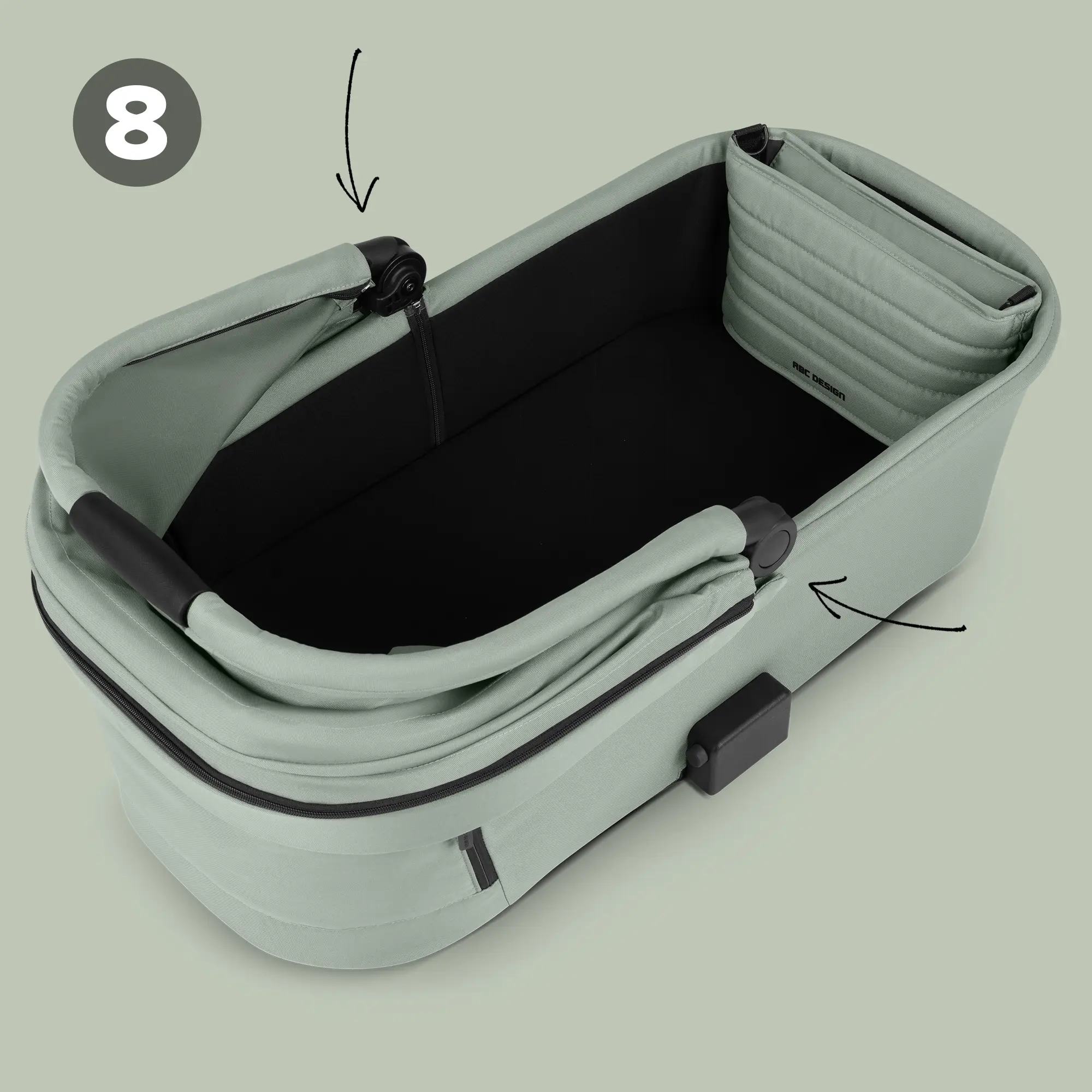 Ahora puedes plegar nuestro nuevo capazo aún más fácilmente. En la parte inferior encontrarás dos palancas con las que podrás desbloquear el capazo y plegarlo fácilmente. Gracias a las piezas de conexión rediseñadas en los laterales, el capazo es ahora mucho más plano. Con el capazo antiguo, para plegarlo había que sacar el colchón del interior y desbloquear las dos abrazaderas metálicas. Ahora esto ya no es necesario y resulta mucho más cómodo. El capazo no está incluido en el volumen de suministro del Samba 2 y está disponible como accesorios.